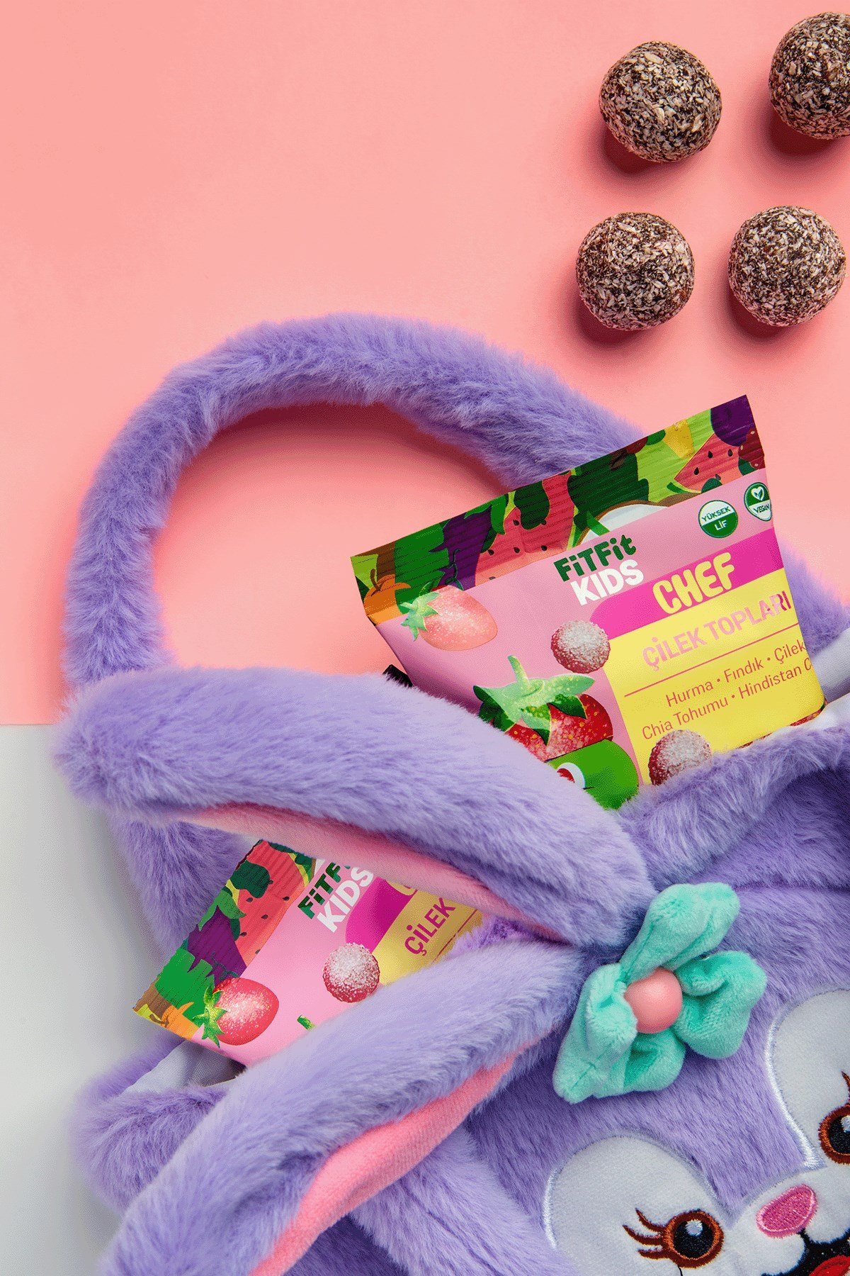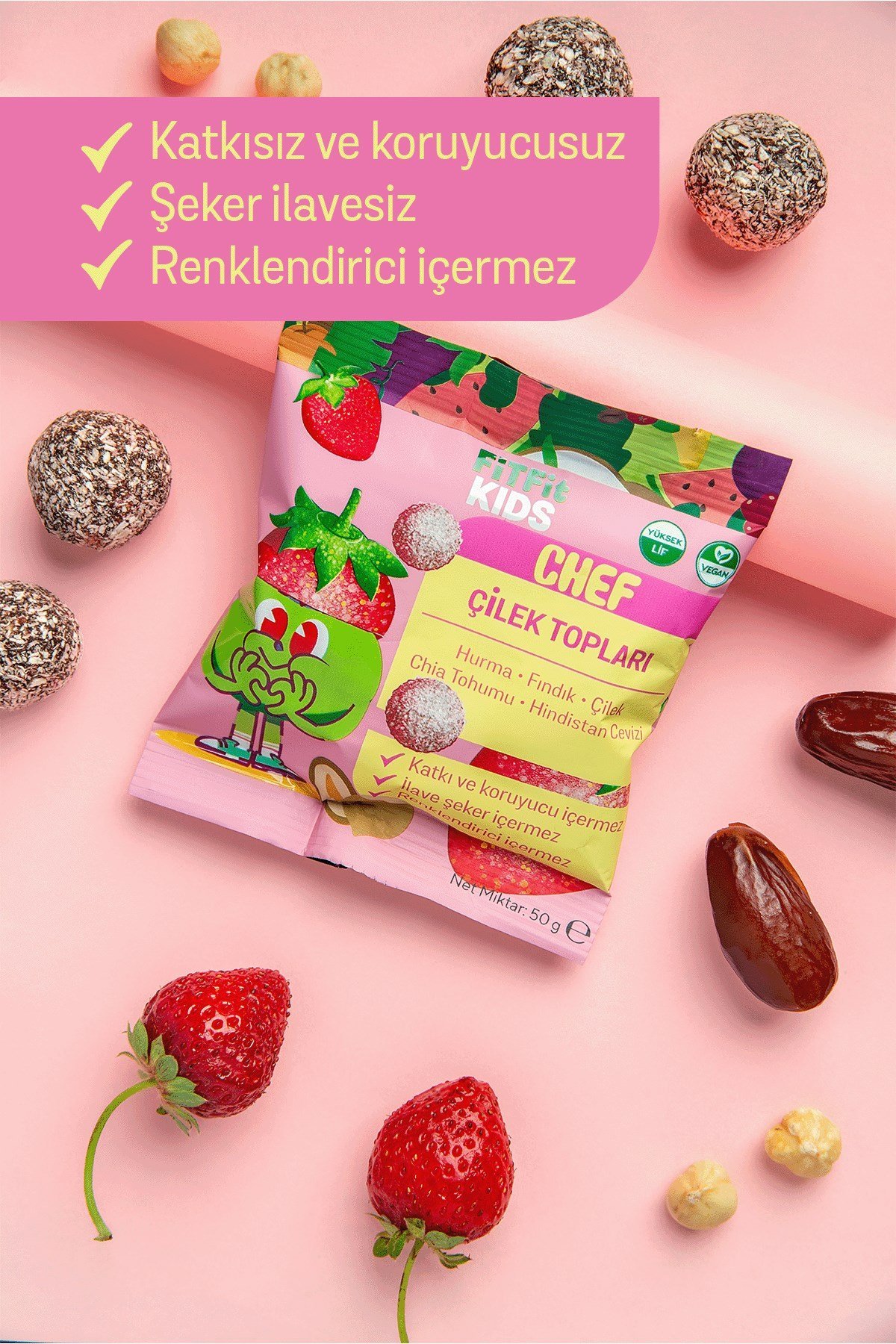 FitFit Kids Chef Çilek Topları, çocuklara özel geliştirilmiş doğal çilekli atıştırmalık tır. Hurma, fındık, çilek, chia tohumu ve hindistan cevizi ile hazırlanan bu şekersiz ve katkısız formül; yoğun çilek aroması, hurmanın doğal tatlılığı ve chia tohumunun lif zenginliği ile birleşerek sağlıklı bir vegan çocuk atıştırmalığı sunar.