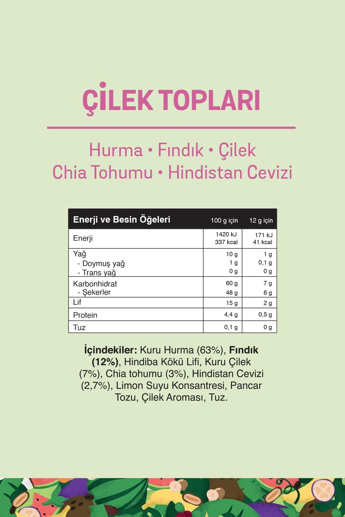 Kuru Hurma Ezmesi (63%), Fındık (12%), Hindiba Kökü Lifi, Kuru Çilek (7%), Chia Tohumu (3%), Hindistan Cevizi (2,7%), Limon Suyu Konsantresi, Pancar Tozu, Çilek Aroması, Tuz.
