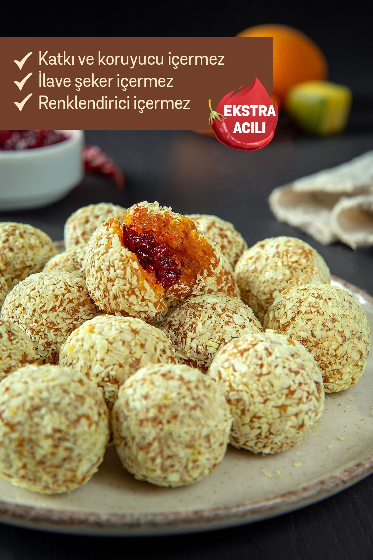 FiTFit Hindistan Cevizi Kaplı Ekstra Acı Dolgulu Mangolu Top, mango ve kayısının tropikal lezzetini acı biber ekstresinin sürpriz etkisiyle birleştirir. Hindistan cevizi kaplaması, ürüne hafif tatlı bir denge kazandırırken, doğal hurma ve meyve içerikleriyle gün boyu süren enerji sağlar.