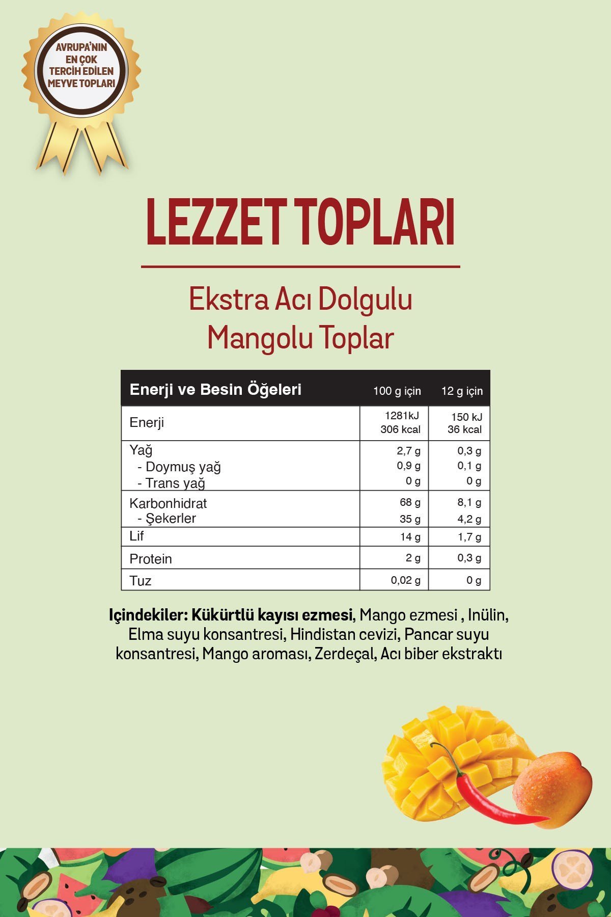 İçindekiler: Kükürtlü kayısı ezmesi (%50), mango ezmesi (%30), inülin, elma suyu konsantresi, hindistan cevizi (%3,8), pancar suyu konsantresi, mango aroması, zerdeçal, acı biber ekstraktı (%0,06).