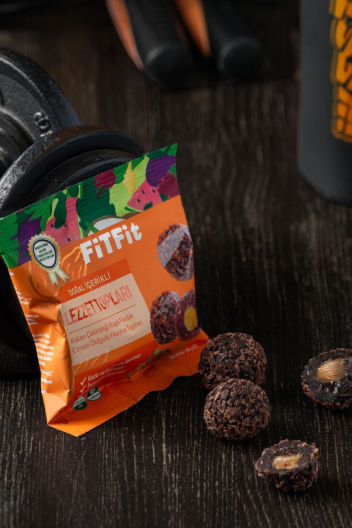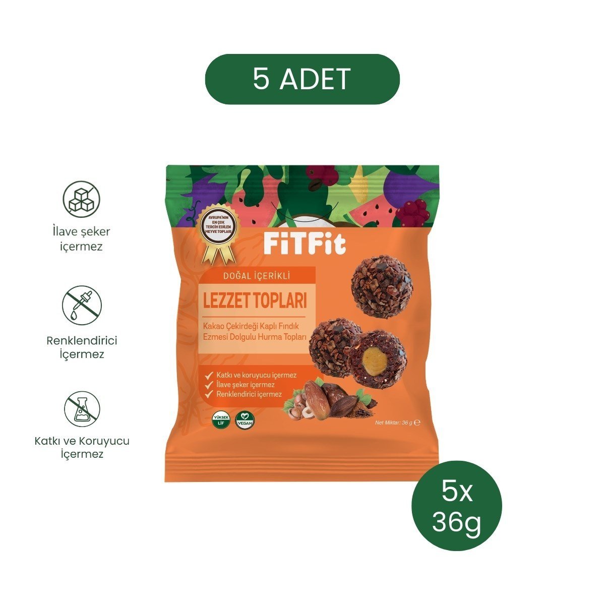 FitFit Kakao Çekirdeği Kaplı Fındık Ezmesi Dolgulu Hurma Meyve Topları, Doğal Atıştırmalık 36gr X 5