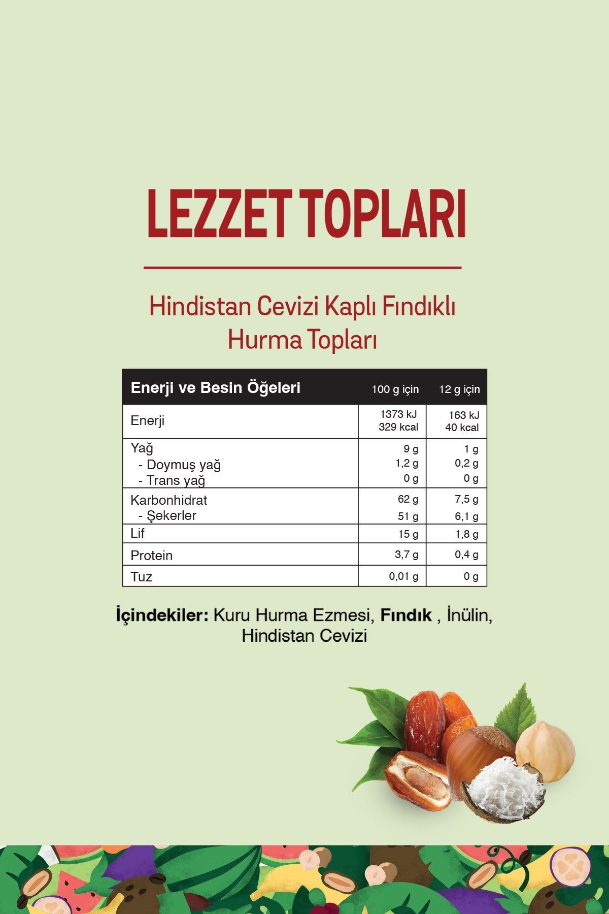 Kuru Hurma Ezmesi (%78), Fındık (%10), İnülin, Hindistan Cevizi (%4)