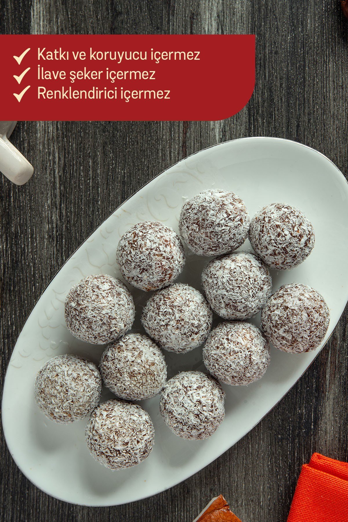Hindistan cevizi kaplı fındıklı hurma topları, hurmanın doğal şekerleri ve fındığın besleyici yapısını bir araya getirir. Katkı, koruyucu ve rafine şeker içermeyen formülüyle hem sağlıklı hem de tatlı bir atıştırmalık arayanlar için hafif bir alternatif sunar.