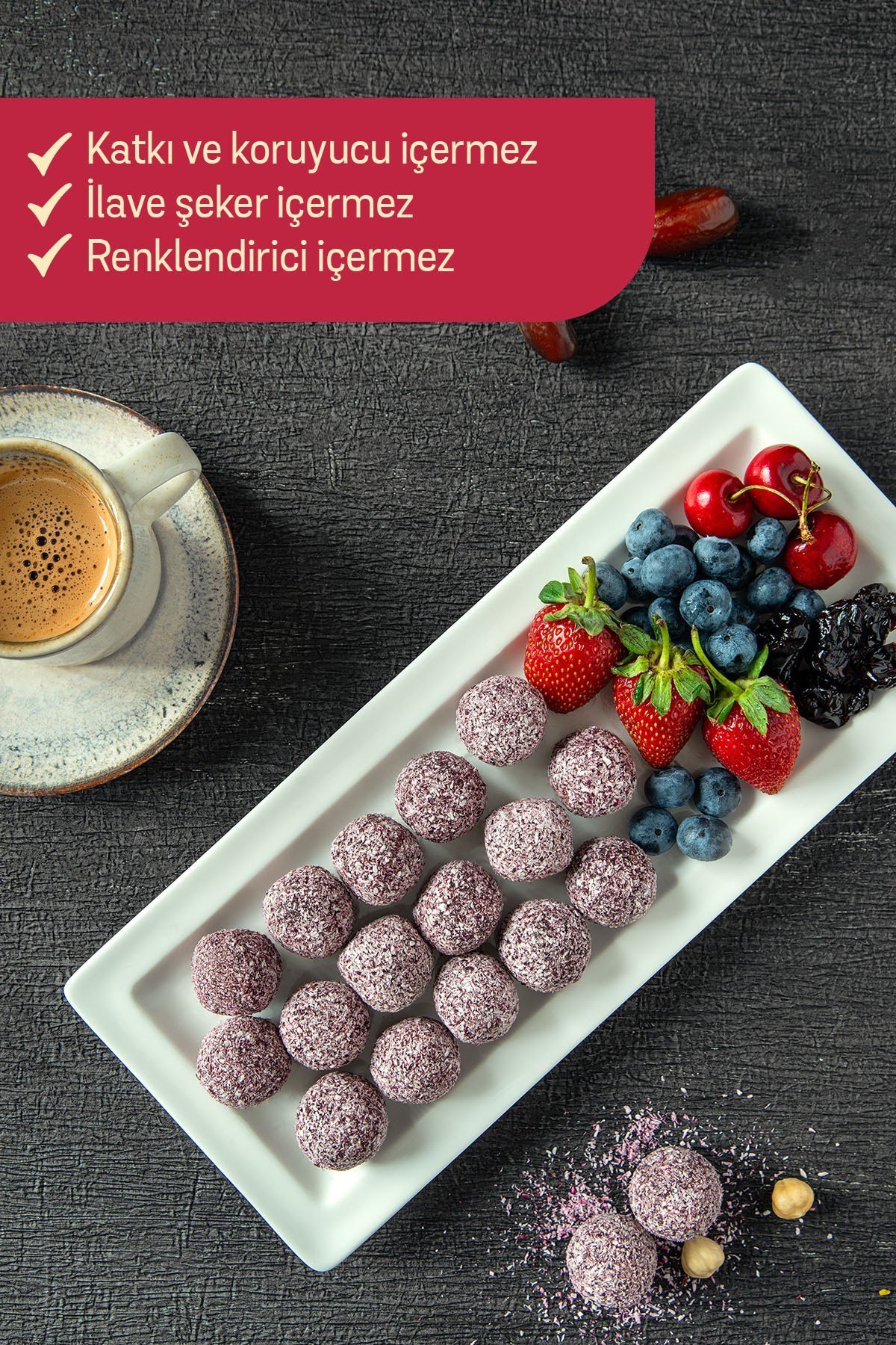 Her bir top, %77,6 hurma ezmesiyle doğal tatlılık sağlar; siyah havuç, vişne, çilek ve turna yemişi gibi meyvelerle antioksidan yönü güçlendirilmiştir. Hindistan cevizi kaplaması ürüne hafif tropikal bir aroma kazandırır, fındık parçaları ise yumuşak dokusuna çıtırlık katar.