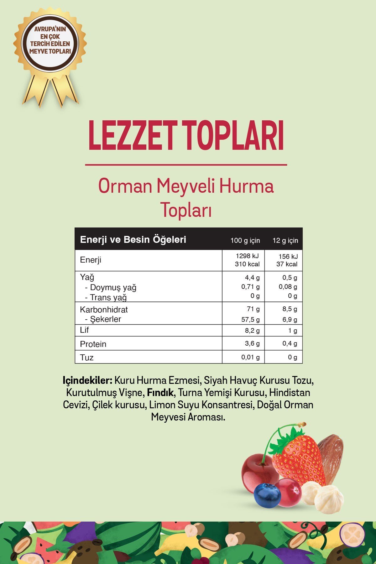 Kuru hurma ezmesi (%77,6), siyah havuç kurusu tozu, kurutulmuş vişne, fındık (%4), turna yemişi kurusu, hindistan cevizi (%2,5), çilek kurusu, limon suyu konsantresi, doğal orman meyvesi aroması.