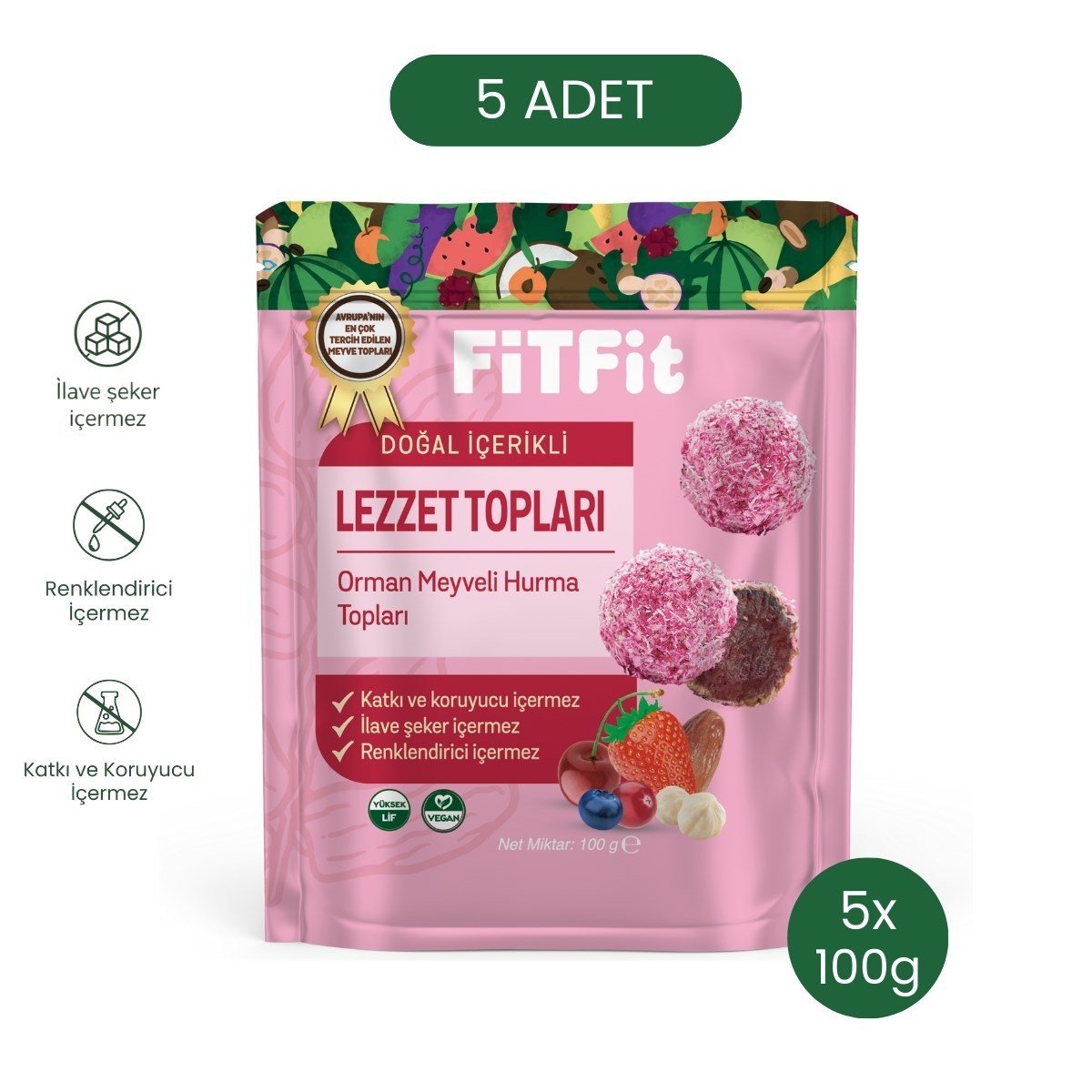 FiTFit Doğal İçerikli Sağlıklı Lezzet Topları | Orman Meyveli Hurma Meyve Topları, 100 gr x 5 Adet