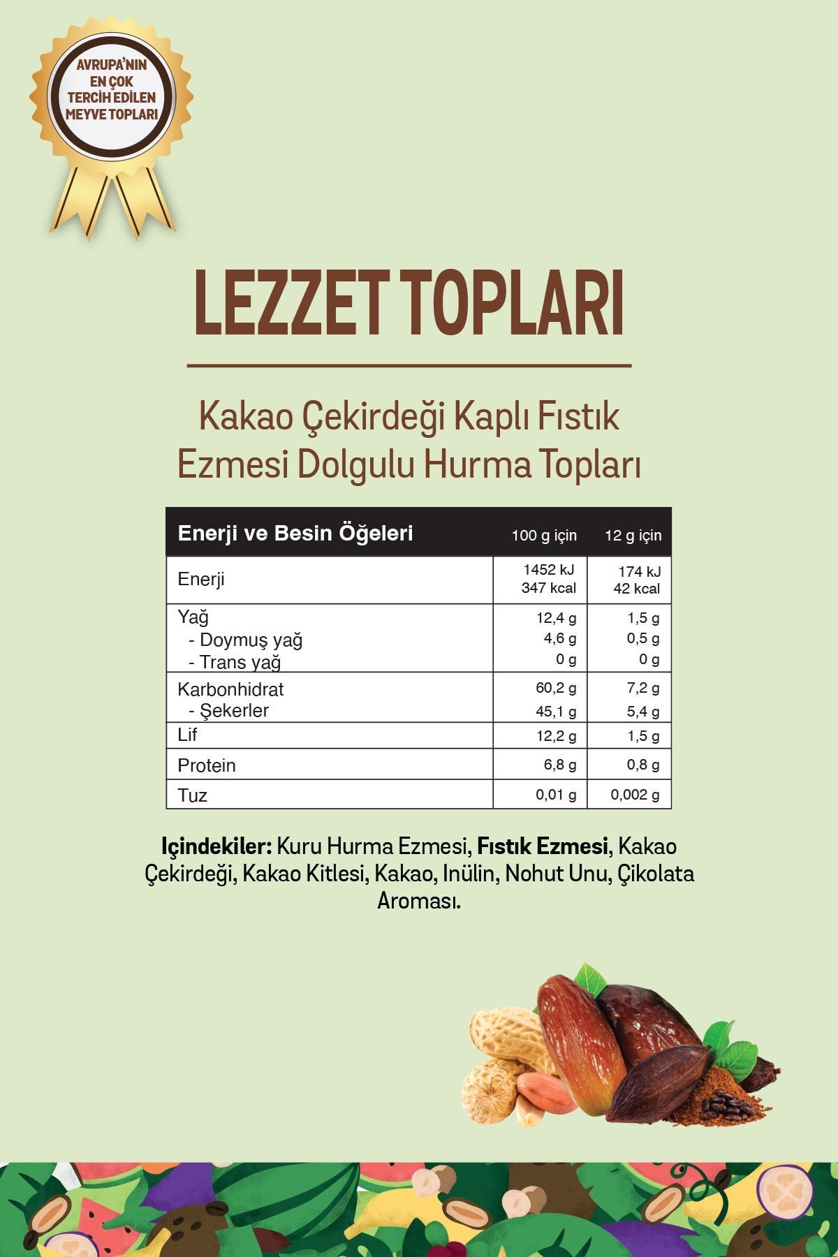 İçindekiler: Kuru hurma ezmesi (%67,80), fıstık ezmesi (%13), kakao çekirdeği (%5), kakao kitlesi, kakao, inülin, nohut unu, doğal çikolata aroması.