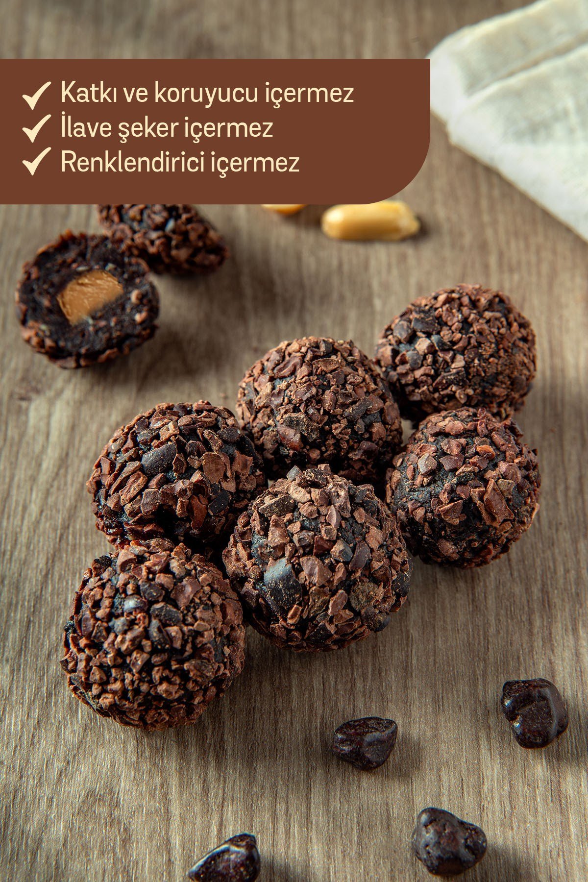 Her bir top, %67,8 oranında hurma ezmesiyle doğal enerji sağlar. %13 fıstık ezmesi dolgusu bitkisel protein kaynağıdır. Kakao çekirdeği ve kakao kitlesinden gelen yoğun çikolata aroması, tamamen doğal formda lezzet sunar. İnülin lif desteğiyle sindirimi destekler, nohut unu ise bitkisel protein katkısı sağlar.