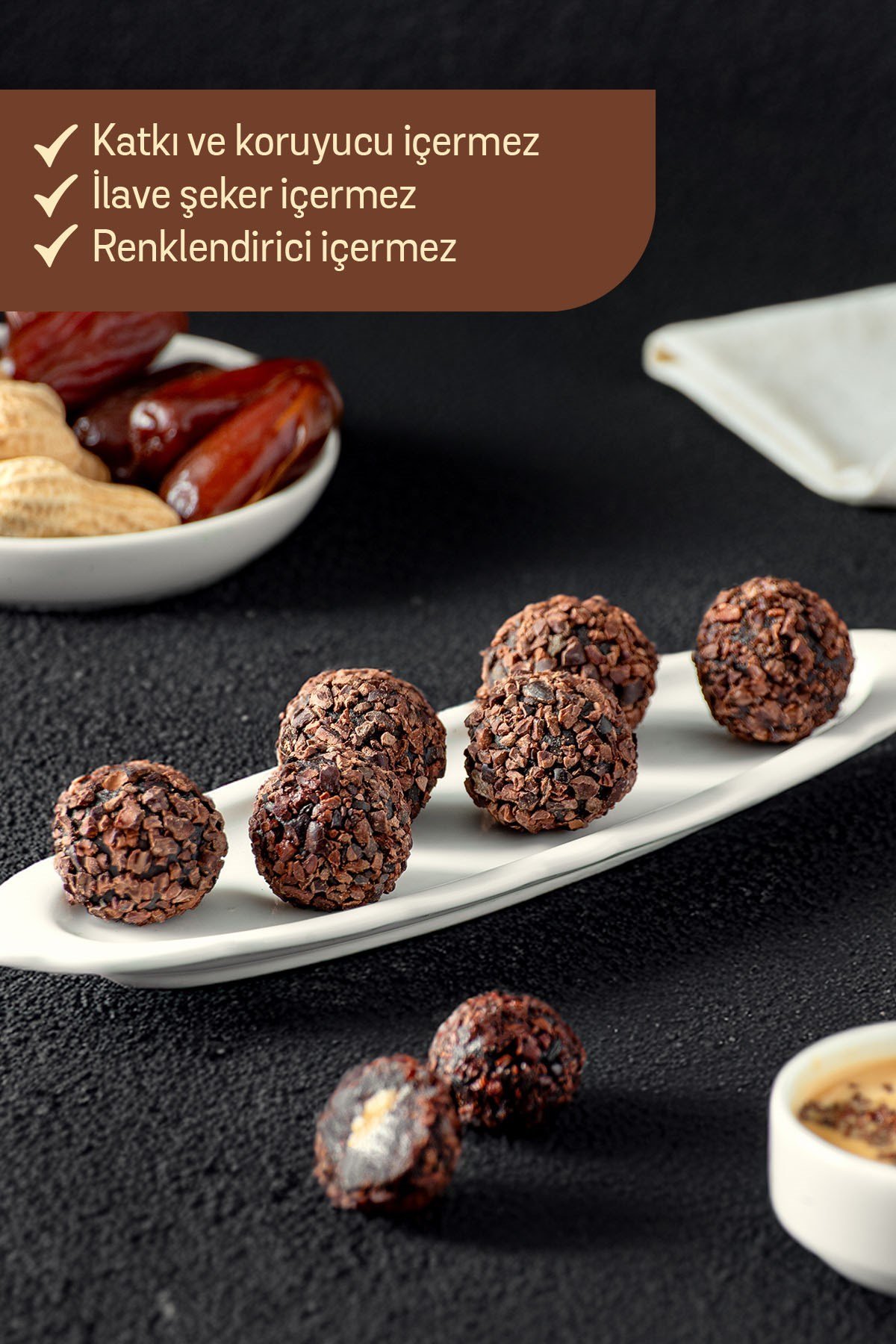 İçindekiler: Kuru hurma ezmesi (%67,80), fıstık ezmesi (%13), kakao çekirdeği (%5), kakao kitlesi, kakao, inülin, nohut unu, doğal çikolata aroması.