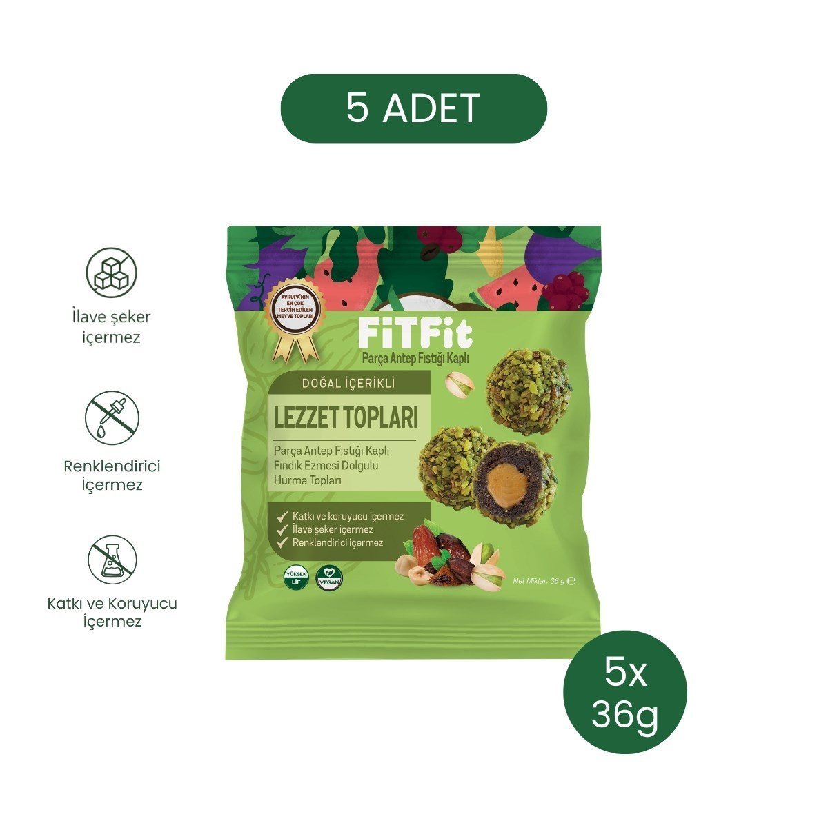 FitFit Antep Fıstıklı ve Fıstık Ezmesi Dolgulu Hurmalı Meyve Topları, Doğal Atıştırmalık 36GR X 5 A