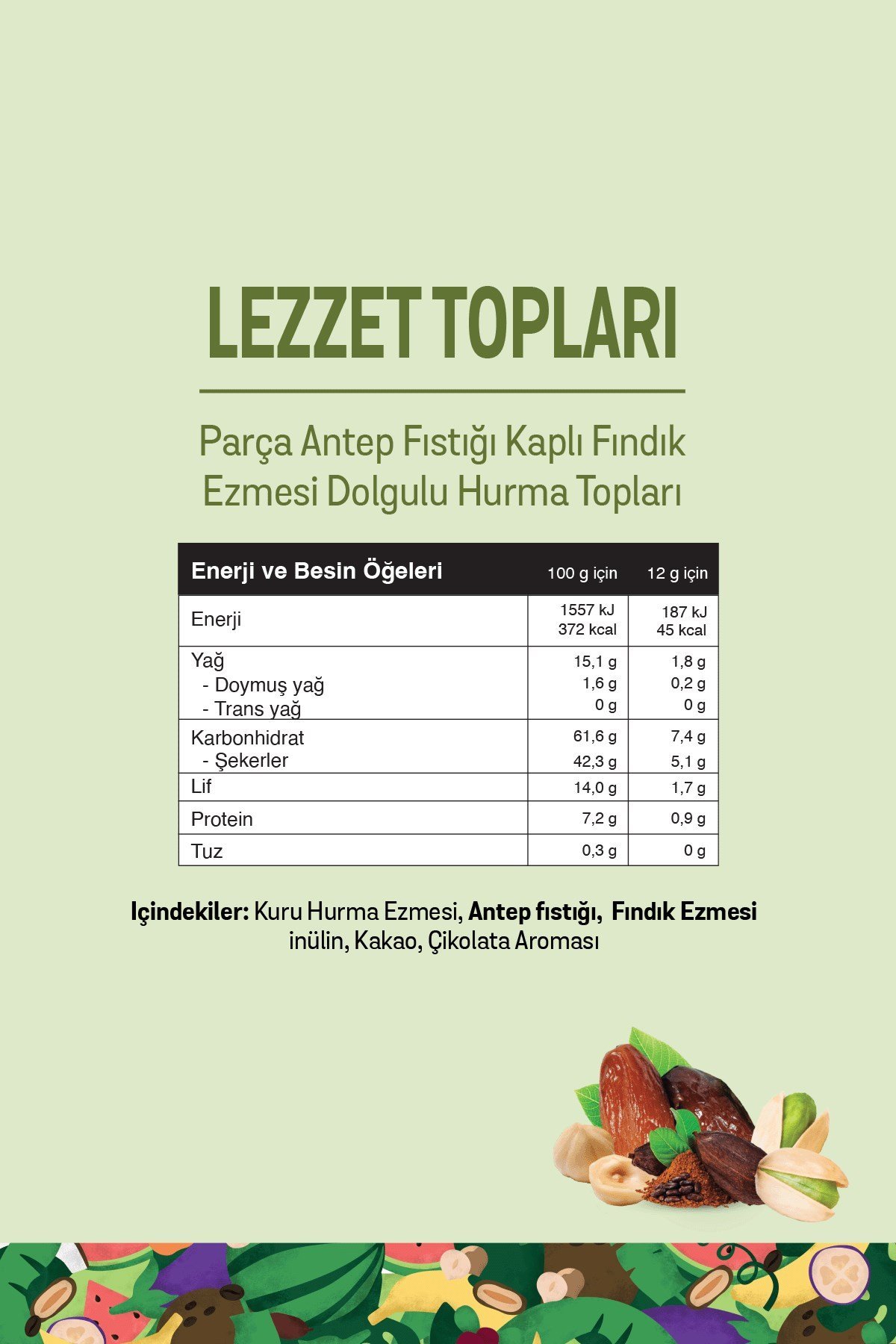 İçindekiler: Kuru hurma ezmesi (%63,8), Antep fıstığı (%15), fındık ezmesi (%12), inülin, kakao, doğal çikolata aroması.