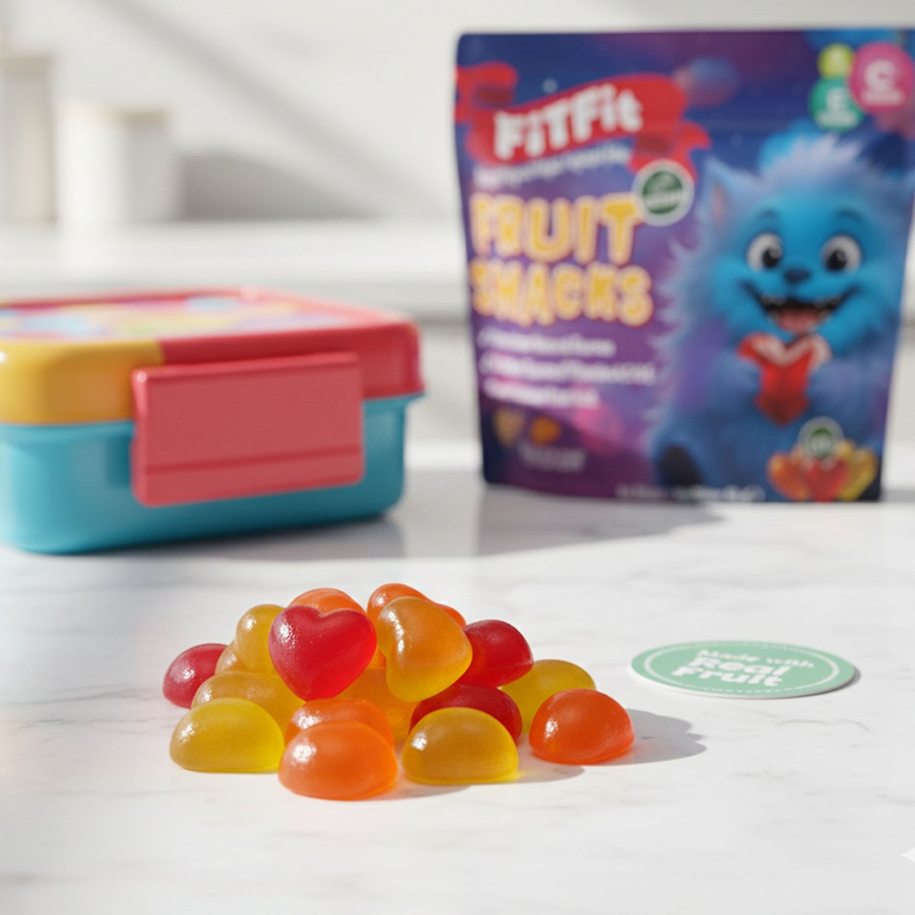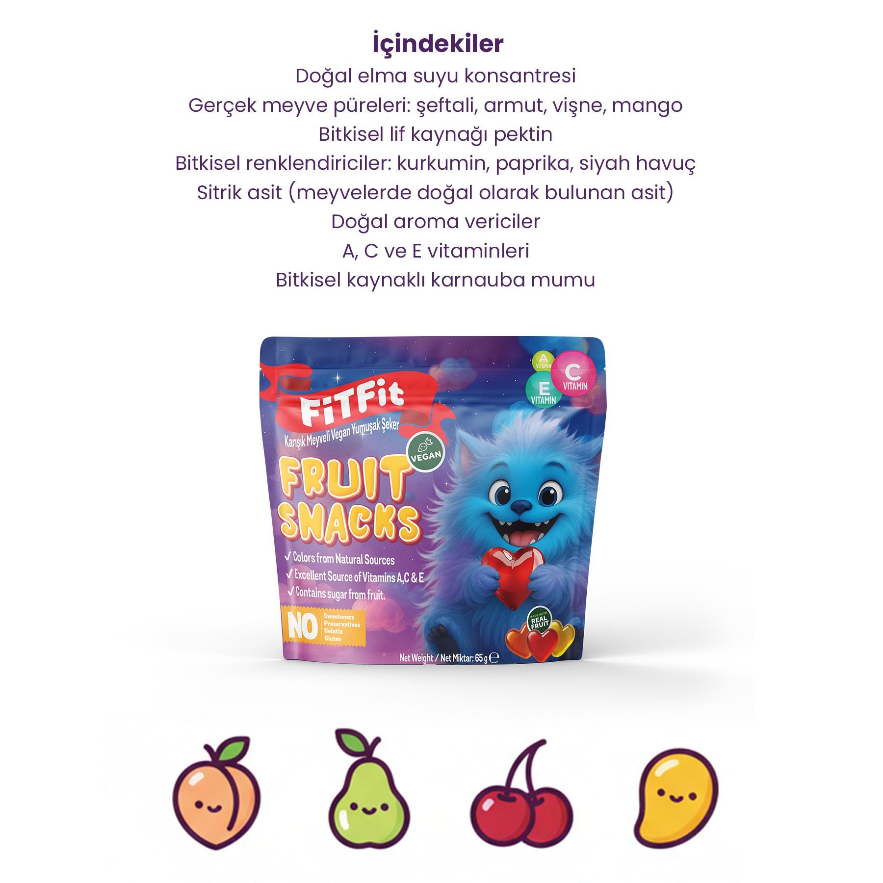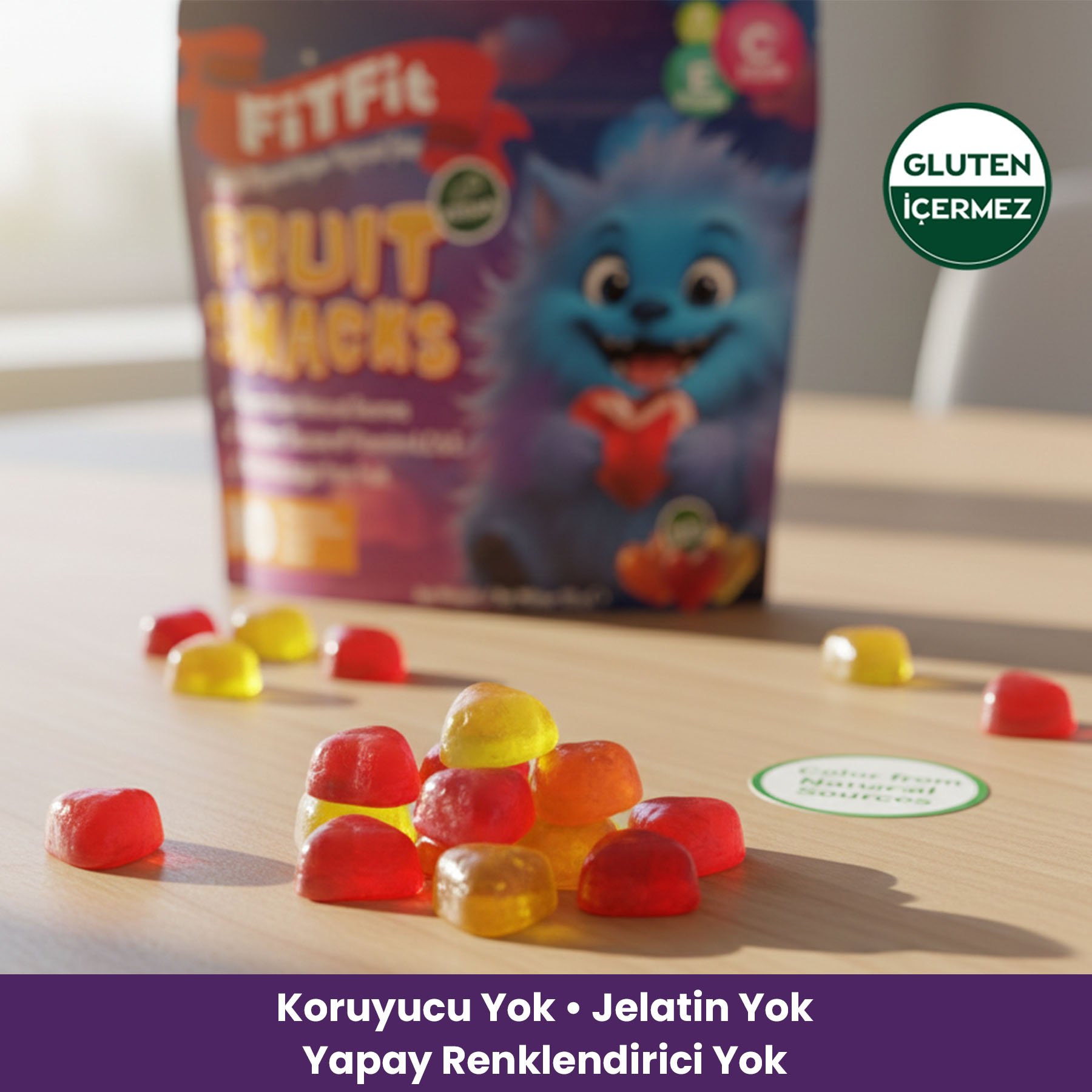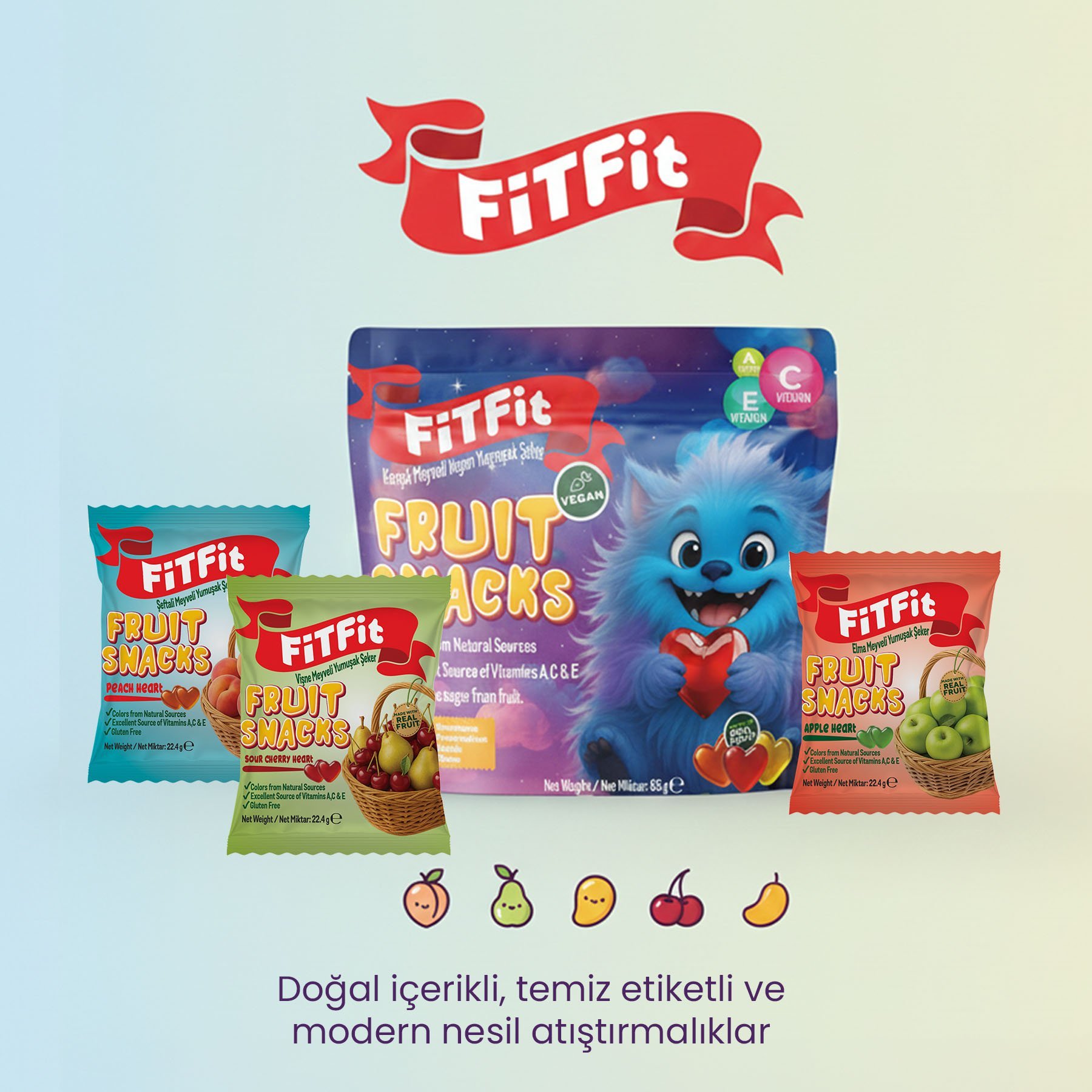 Gerçek meyvelerle hazırlanmış, jelatin içermeyen, tamamen vegan ve glutensiz formülüyle FitFit; miniklerin severek yediği, ebeveynlerin güvenle sunduğu modern nesil bir meyveli yumuşak gummy tarzı şeker.