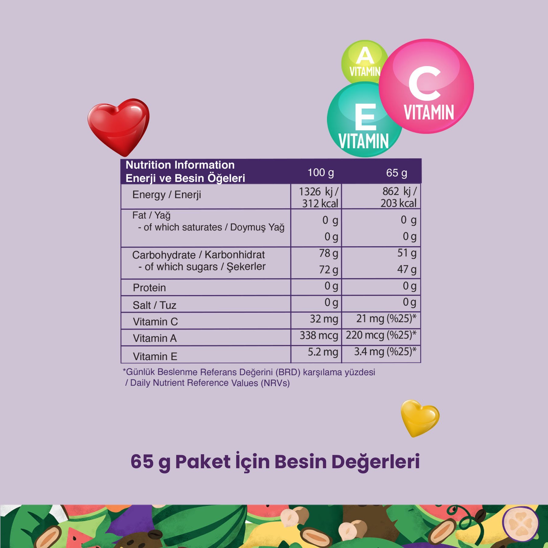 Üstelik her pakette çocukların günlük ihtiyacını destekleyen Vitamin A, C ve E bulunur. Yani sadece bir atıştırmalık değil; gelişim dönemindeki minikler için akıllı bir seçimdir.