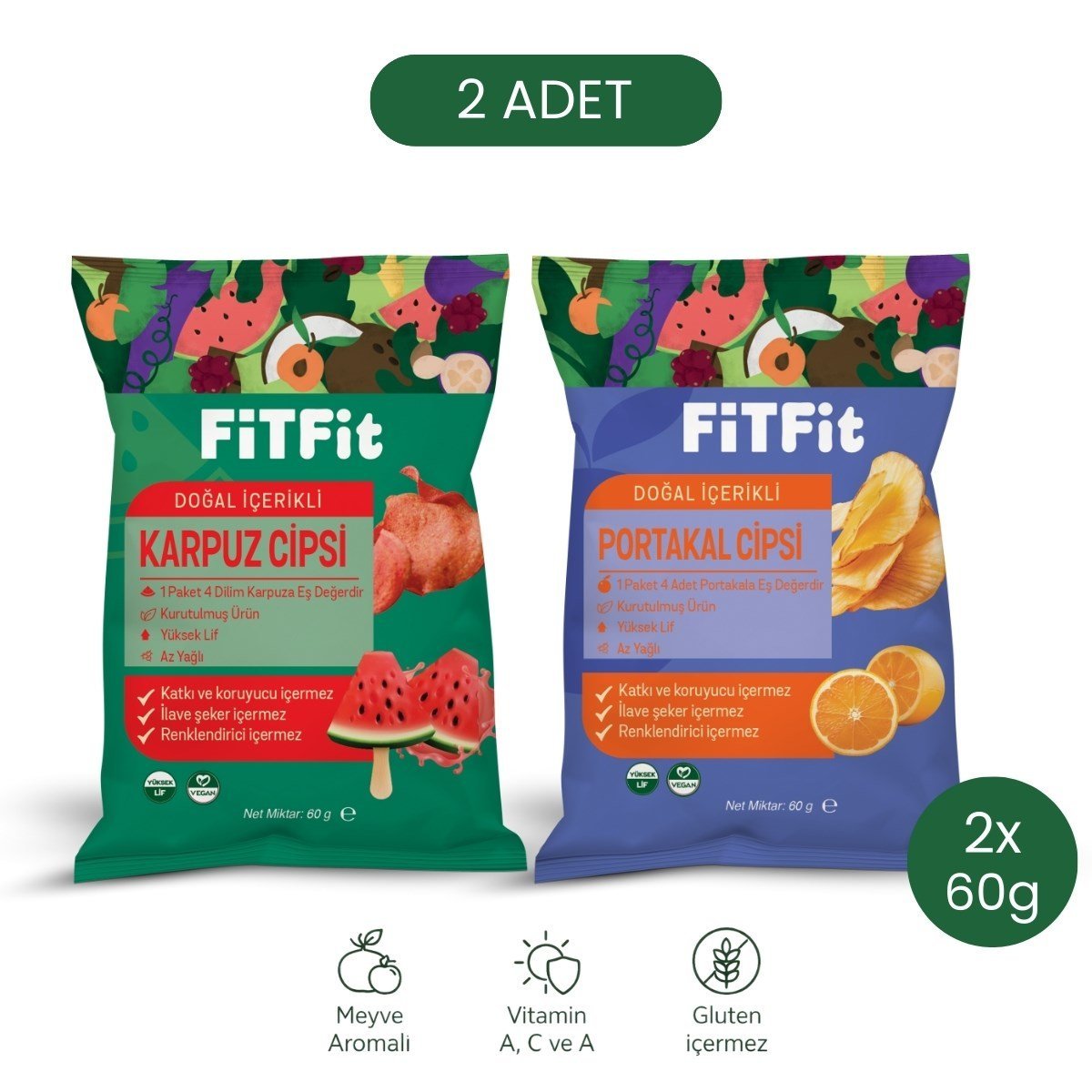 14 g (porsiyon başına)FitFit’in doğal meyvelerden üretilen Portakal Cipsi ve Karpuz Cipsi çeşitlerini bir arada sunan 2’li Deneme Paketi, katkısız ve pratik atıştırmalık arayanlar için ideal bir seçenektir. Meyvenin doğal tadını koruyan kurutma yöntemiyle hazırlanır.